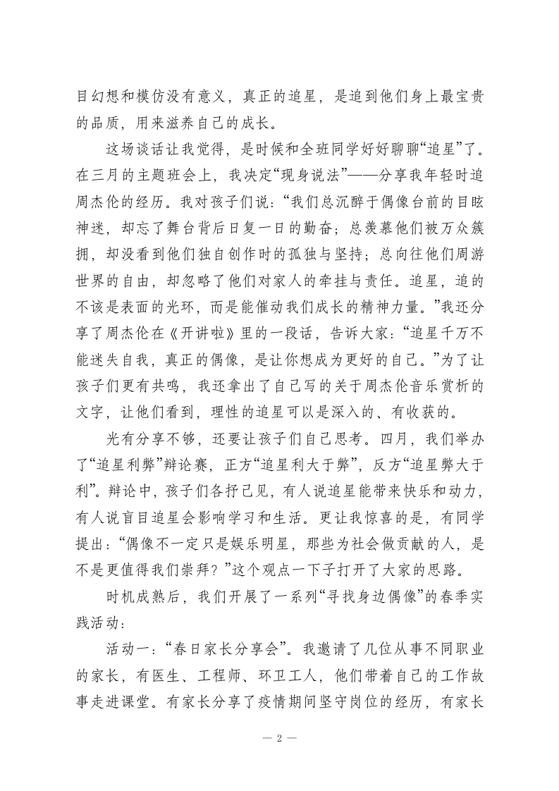班级理性追星引导实践:春启追星观,逐光做自己各位评委老师好!今天我想分享的,是本学期,我在班级里开展的一场关于“追星”的引导实践。开学没多久,我在整理学生抽屉时,发现了一个让我揪心的神秘盒子:里面贴着一张自制海报,主角是班里的女生小A,旁边P着她的偶像蔡徐坤,海报上赫然写着“蔡徐坤老婆“恋爱就要现在”的字样。更让我警觉的是,类似的情况不止一例有同学在作业本上纠结“选肖战还是王一博”,课桌上刻满了明星名字,课间讨论的话题也总围着偶像的八卦打转。通过私下沟通和匿名调查,我发现班里的追星热潮已经愈演愈烈。深入分析后我意识到,孩子们的追星,本质上是对成功的向往、对自我价值的追寻,只是这份向往少了些理性,这份追寻也迷失了方向一一他们崇拜明星的光鲜外表,却看不到背后的付出;向往偶像的成功,却忘了自身的成长。以往简单的说教只会引发逆反,本学期,我决定换一种方式,和孩子们一起重新定义“追星”。我先从发现海报的小A入手。提前做足功课,查了不少青少年追星心理学的资料,梳理好沟通思路后,我找她聊了聊。没有批评指责,只是问她:“你喜欢蔡徐坤的什么呀?”她说是舞台上的光芒和帅气。我接着问:“那你知道他为了这个舞台练了多久吗?他遇到困难时是怎么坚持下来的?”我告诉她,明星和我们之间隔着屏幕,我们看到的只是他们想展示的一面,盲1
