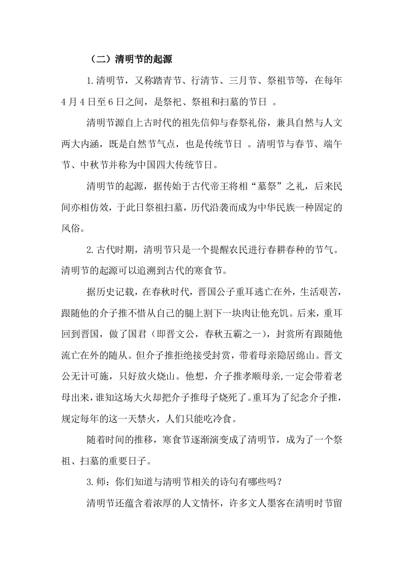 《清明假期至安全要牢记》教学设计晨晨老师前天发布关注私信16.15KB7页0215 以下为资料部分截图预览,下载后为超高清原文件。 第1页 / 共7页 第2页 / 共7页 试读已结束,还剩5页,您可下载完整版后进行离线阅读 加入VIP,享海量教务资料,无限制免费下载所有材料 《清明假期至安全要牢记》教学设计此内容为付费资源,请付费后查看¥9.9¥15.9VIP会员免费代理(享70%分佣)免费立即购买您当前未登录!建议登陆后购买,可保存购买订单付费资源© 版权声明文章版权归作者所有,未经允许请勿转载。THE END教案课件 文本预览 《清明假期至安全要牢记》教学设计班会主题:《清明假期至安全要牢记》班会目标:1.让学生了解清明节的传统文化习俗和意义。2.增强学生的安全意识,预防清明节期间可能发生的各类安全事故。文明祭祖,知道森林防火的重要性,要爱护森林。通过对火灾事件的了解,知道发生火灾的主要原因,提高学生的防火意识,使学生懂得溺水的主要原因和自救的方法,强化防溺水的意识。学习交通安全、饮食安全、居家安全、出游安全等相关知识。3.培养学生遵守社会公德、尊重生命,时刻注意安全的良好习惯。班会准备:PPT课件及相关材料班会活动过程:(一)活动导入师:同学们,清明假期马上就到了。这既是缅怀先人的时节,也是大家放松身心、亲近自然的好机会。但安全问题不容忽视,假期出行人流大,路况复杂,用火场景增多。为了让大家都能平安过节,今天我们召开这场清明假期安全班会,一起聊聊出行、祭扫、居家等各方面的安全注意事项,希望每位同学都牢记于心,度过一个安全文明的清明假期。 查看更多 收起部分 喜欢就支持一下吧点赞5 分享QQ空间微博QQ好友海报分享复制链接收藏