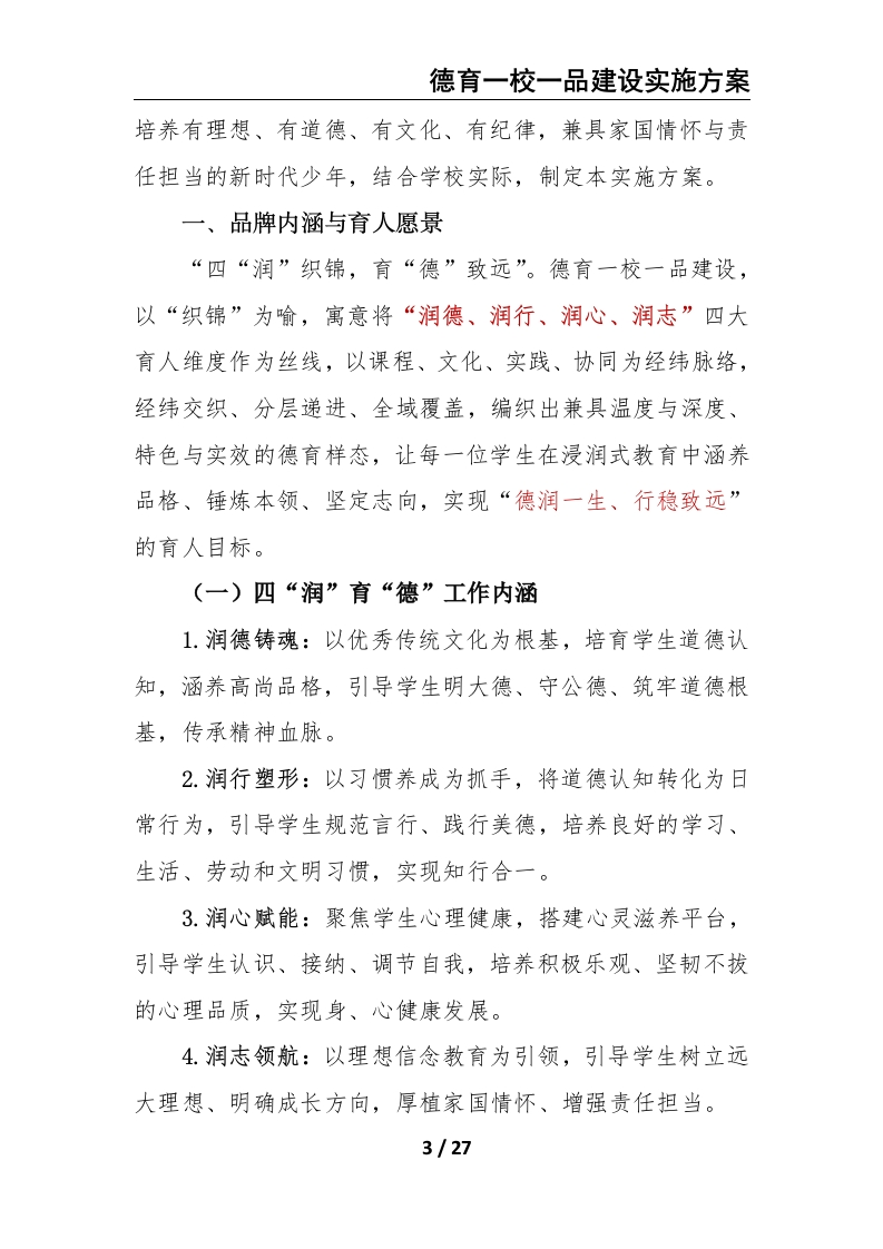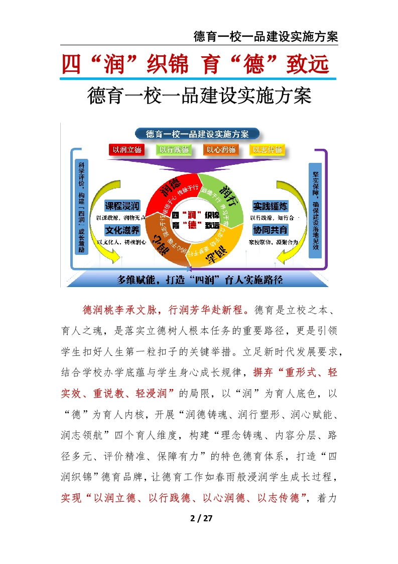 四“润”织锦育“德”致远——德育一校一品建设实施方案晨晨老师2小时前发布关注私信2.01MB27页02815 以下为资料部分截图预览,下载后为超高清原文件。 第1页 / 共27页 第2页 / 共27页 第3页 / 共27页 试读已结束,还剩24页,您可下载完整版后进行离线阅读 加入VIP,享海量教务资料,无限制免费下载所有材料 四“润”织锦育“德”致远——德育一校一品建设实施方案此内容为付费资源,请付费后查看¥9.9¥15.9VIP会员免费代理(享70%分佣)免费立即购买您当前未登录!建议登陆后购买,可保存购买订单付费资源© 版权声明文章版权归作者所有,未经允许请勿转载。THE END德育工作 文本预览 德育一校一品建设实施方案四“润”织锦育“德”致远德育一校一品建设实施方案一、品牌内涵与育人愿景….2二、分层深耕,构建“四润”德育特色内容5(一)润德一一植德于心,传脉于行5(二)润行一一践德于行,养习于常.7(三)润心一一润心于暖,强志于行.8(四)润志一一立志于幼,逐梦于行10三、多维赋能,打造“四润”育人实施路径.…12(一)课程浸润一一以课载德,润物无声….12(二)文化滋养一一以文化人,铸魂润心...13(三)实践锤炼一一以行践德,知行合…15(四)协同共育一一家校联动,凝聚合力.17四、科学评价,构建“四润”成长激励体系.….18五、坚实保障,确保品牌建设落地见效:21六、实施步骤与阶段安排…241/27 查看更多 收起部分 喜欢就支持一下吧点赞15 分享QQ空间微博QQ好友海报分享复制链接收藏