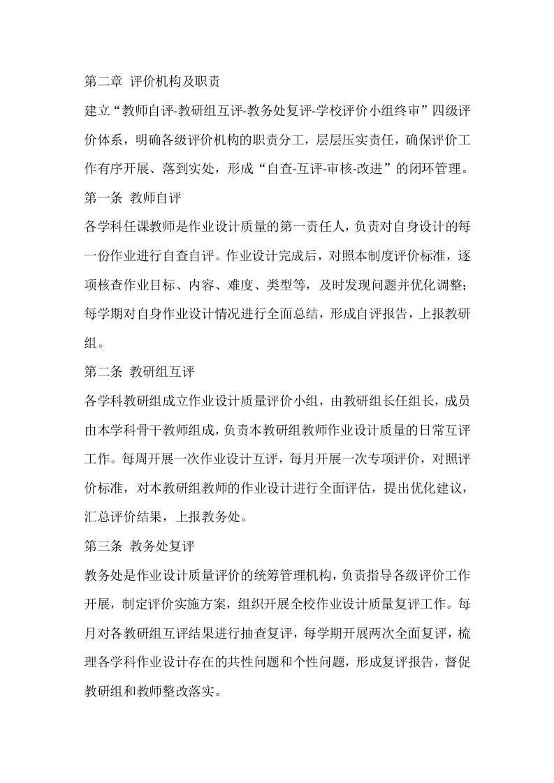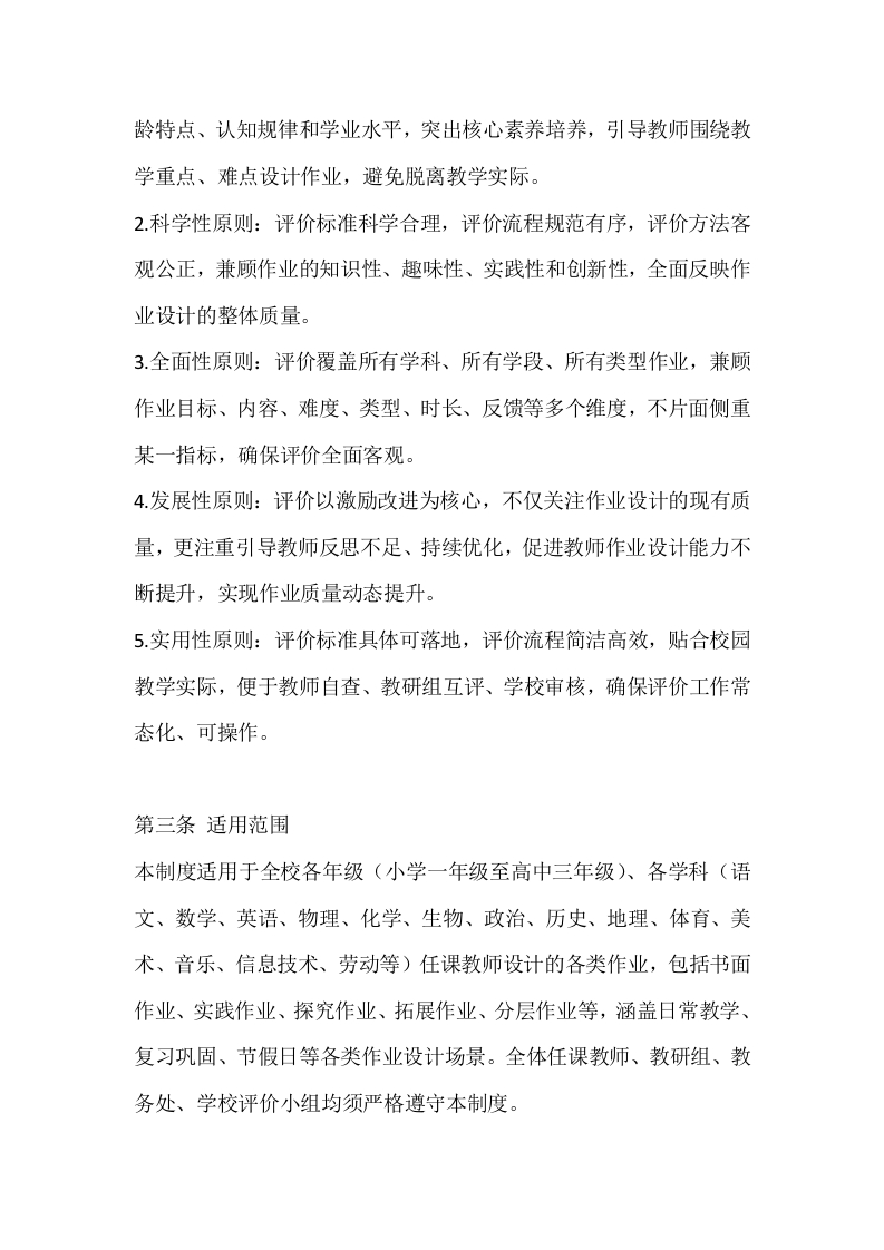 学校作业设计质量评价制度晨晨老师7小时前发布关注私信18KB11页0319 以下为资料部分截图预览,下载后为超高清原文件。 第1页 / 共11页 第2页 / 共11页 第3页 / 共11页 试读已结束,还剩8页,您可下载完整版后进行离线阅读 加入VIP,享海量教务资料,无限制免费下载所有材料 学校作业设计质量评价制度此内容为付费资源,请付费后查看¥9.9¥15.9VIP会员免费代理(享70%分佣)免费立即购买您当前未登录!建议登陆后购买,可保存购买订单付费资源© 版权声明文章版权归作者所有,未经允许请勿转载。THE END计划总结 文本预览 学校作业设计质量评价制度为深入落实国家“双减”政策,规范作业设计行为,提升作业设计质量,发挥作业巩固知识、培养能力、促进学生全面发展的核心作用,杜绝机械重复、超纲超标、无效低效作业,结合我校教学实际,特制定本作业设计质量评价制度。本制度适用于全校各年级、各学科任课教师的作业设计工作,涵盖课堂作业、课后作业、周末作业、节假日作业及实践类、探究类等各类作业,作为作业设计质量评估、教师教学考核的重要依据,推动我校作业设计工作科学化、规范化、优质化发展。第一章总则第一条制定目的坚持“立德树人”根本任务,以学生核心素养发展为导向,通过建立科学、系统的作业设计质量评价机制,引导教师树立“提质减量、精准高效”的作业设计理念,优化作业内容与形式,提升作业设计的针对性、实践性和创新性,让作业真正成为衔接教学、巩固知识、培养能力、促进学生自主学习的重要载体,切实减轻学生过重课业负担,促进学生身心健康成长。第二条基本原则1.导向性原则:作业设计评价紧扣课程标准和教学目标,贴合学生年 查看更多 收起部分 喜欢就支持一下吧点赞9 分享QQ空间微博QQ好友海报分享复制链接收藏