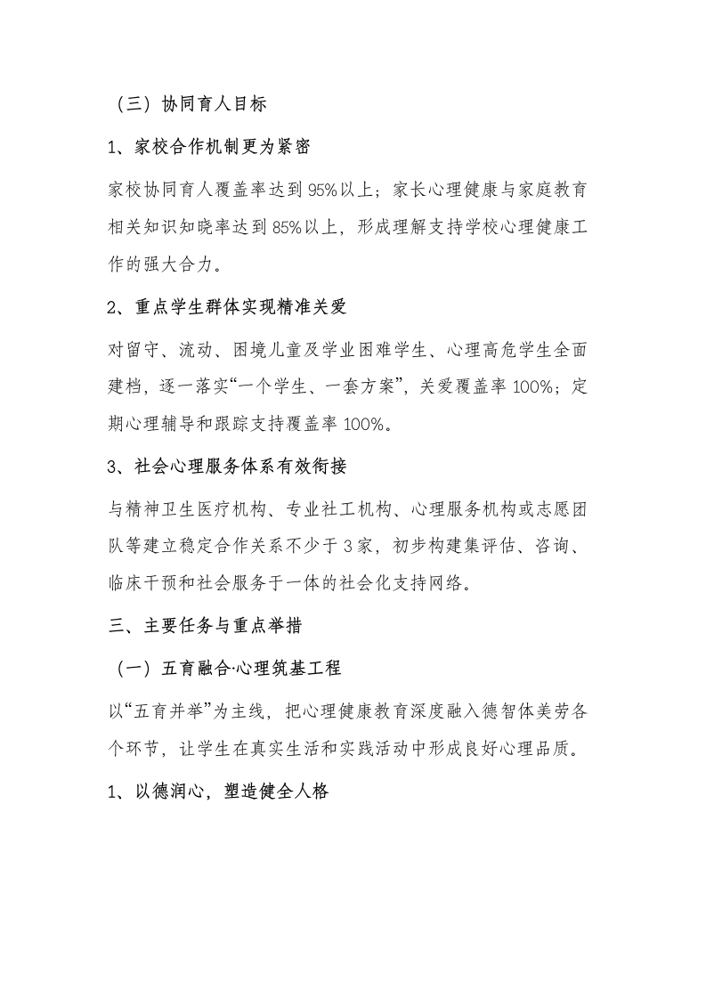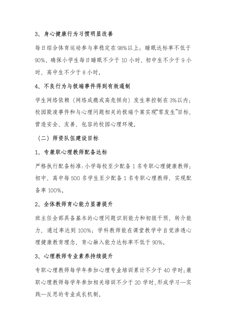 学校落实“健康第一”心理健康促进行动方案(2026版)晨晨老师2小时前发布关注私信25.24KB16页04615 以下为资料部分截图预览,下载后为超高清原文件。 第1页 / 共16页 第2页 / 共16页 第3页 / 共16页 试读已结束,还剩13页,您可下载完整版后进行离线阅读 加入VIP,享海量教务资料,无限制免费下载所有材料 学校落实“健康第一”心理健康促进行动方案(2026版)此内容为付费资源,请付费后查看¥9.9¥15.9VIP会员免费代理(享70%分佣)免费立即购买您当前未登录!建议登陆后购买,可保存购买订单付费资源© 版权声明文章版权归作者所有,未经允许请勿转载。THE END书香校园作业设计 文本预览 一、总体思路与基本原则以《进一步加强中小学生心理健康工作十条措施》和《全面加强和改进新时代学生心理健康工作专项行动计划》为根本遵循,全面落实立德树人根本任务,牢固树立“健康第一”的教育理念。坚持把心理健康教育贯穿德智体美劳全过程,遵循儿童青少年身心发展规律,突出问题导向、系统治理和协同育人,聚焦校园心理工作中的薄弱环节和突出风险点。通过构建“学校统筹、家庭尽责、社会支持、学生自我管理”的心理健康教育体系,推动心理健康工作与日常教育教学深度融合,着力培育学生自尊自信、理性平和、阳光向上的心理品质,为青少年全面发展和终身发展打下坚实基础。二、工作目标(一)学生发展目标1、心理素养普遍提升学生心理健康素养整体达标率不低于90%;100%的学生能够说出本校及社会正规心理求助渠道;至少85%的学生熟练掌握3种以上行之有效的情绪调节方法,具备基本的自我调适能力。2、心理危机防控有效可控学校心理危机早期识别率达到95%以上;对发现的危机个案在24小时内完成初步评估和应急千预;重大危机事件千预处置成功率达到100%,不发生因处置不当引发的次生事件。 查看更多 收起部分 喜欢就支持一下吧点赞15 分享QQ空间微博QQ好友海报分享复制链接收藏