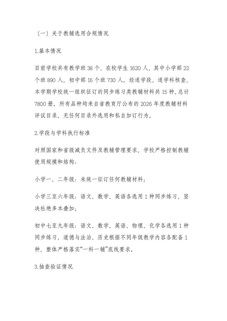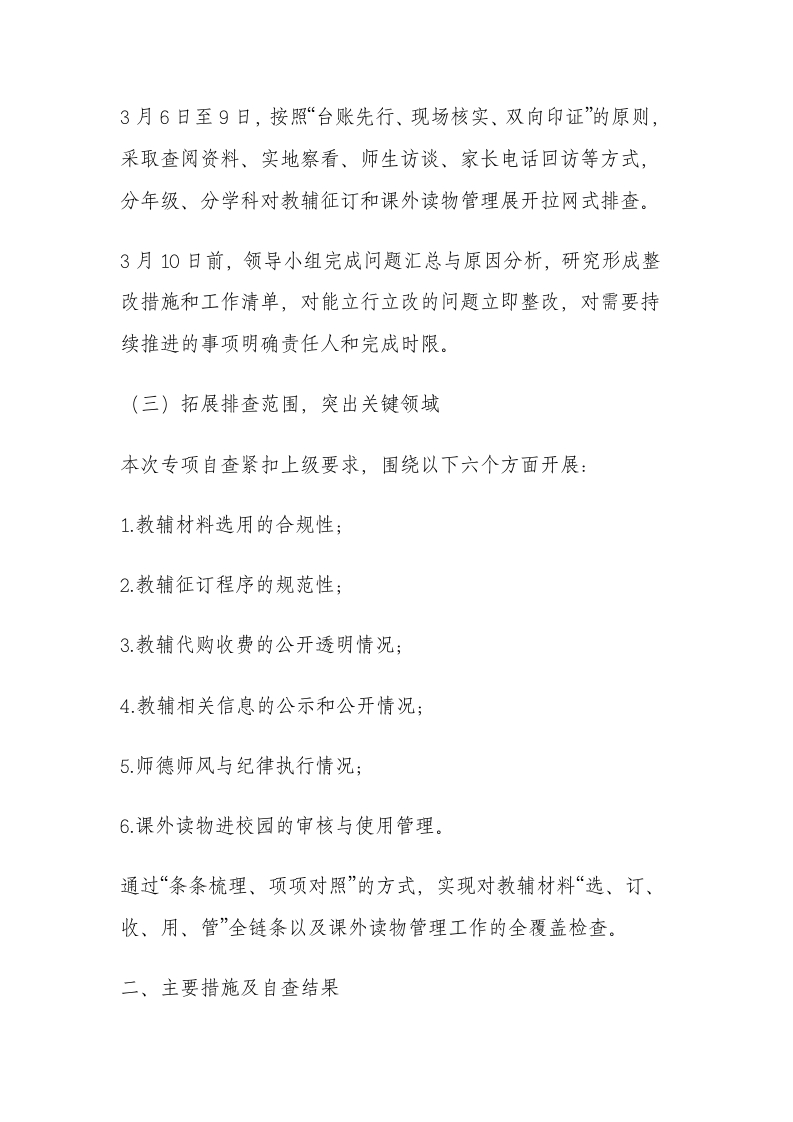 学校关于教辅材料征订管理专项自查情况的报告(2026年)晨晨老师3小时前发布关注私信21.40KB14页0209 以下为资料部分截图预览,下载后为超高清原文件。 第1页 / 共14页 第2页 / 共14页 第3页 / 共14页 试读已结束,还剩11页,您可下载完整版后进行离线阅读 加入VIP,享海量教务资料,无限制免费下载所有材料 学校关于教辅材料征订管理专项自查情况的报告(2026年)此内容为付费资源,请付费后查看¥9.9¥15.9VIP会员免费代理(享70%分佣)免费立即购买您当前未登录!建议登陆后购买,可保存购买订单付费资源© 版权声明文章版权归作者所有,未经允许请勿转载。THE END计划总结 文本预览 根据《中小学教辅材料管理办法》及教育部2025年中小学专项整治推进会、2026年全国基础教育重点工作部署会议精神,我校围绕“合规选用、规范流程、公开透明、严格监管”的总体目标,对教辅材料征订及相关管理工作开展了全流程、全要素的专项自查。现将有关情况报告如下:一、自查工作组织与总体安排(一)加强组织领导,压实工作责任学校成立2026年度教辅材料征订管理专项自查工作领导小组,由校长担任组长,分管副校长任副组长,教务处、德育处、总务处负责人及各年级组长为成员,实行分工明确、责任到人的工作机制,细化“谁主管、谁负责”的要求。领导小组下设办公室,设在教务处,具体负责自查工作的统筹协调、资料收集、情况汇总及整改推进,确保排查不留死角、不留空档。(二)细化工作步骤,统筹推进实施3月5日,学校召开专项自查工作动员会,集中组织全体教职工学习国家和省市关于教辅材料、减负工作等文件,逐条梳理自查要点,明确各岗位职责与时间节点。 查看更多 收起部分 喜欢就支持一下吧点赞9 分享QQ空间微博QQ好友海报分享复制链接收藏