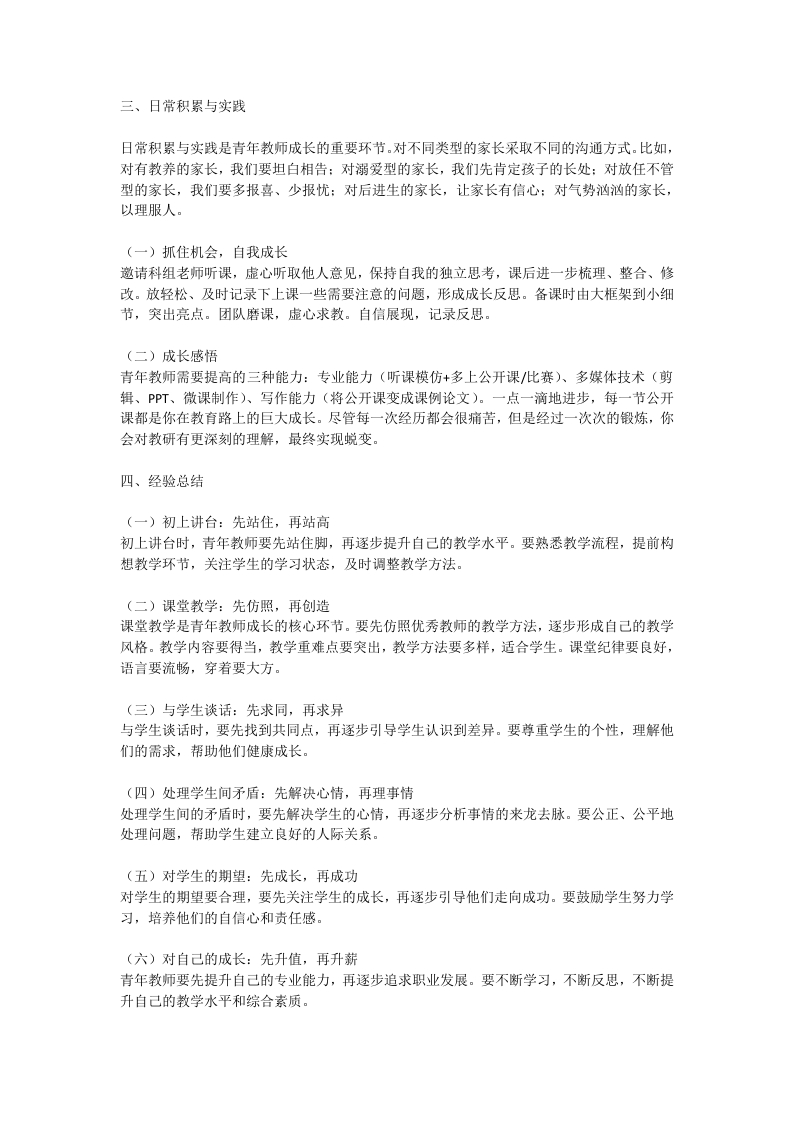 尊敬的各位老师:大家好!今天,我们在这里共同探讨青年教师的成长之路。作为一名班主任,我深知青年教师在入职初期会面临诸多困惑和挑战。今天,我想和大家分享一些经验和建议,希望能对大家有所帮助。一、新教师面临的困惑青年教师在入职初期,往往会遇到各种各样的困惑。比如,班级怎么管理?教学从何下手?怎么和学生沟通?入职后要做什么?怎么教学?如何教好?业务有哪些?学生的学习情况与认知有差异,教师的教法各异,学生成绩不理想,任务重,责任大,未来的发展方向在哪里?这些困惑是正常的,也是每一个青年教师成长过程中必须面对的问题。那么,我们该如何应对这些困惑呢?二、摆脱学生思维,正视教师身份首先,青年教师要尽快摆脱学生思维,正视自己人民教师的身份,尽快适应新环境。角色转变是青年教师成长的第一步。我们要认识到,教师和学生是不同的角色,有着不同的责任和使命。教师不仅要传授知识,更要引导学生健康成长。(一)制定目标给自己制定短期目标、近期目标和长远目标,不断学习提升自己。只有不断提升自己,才能胜任教学需求。对于学生、对于同事、对于领导,都要少点抱怨,多做事,少说话。保持一颗感激之心,感恩身边的人和事,这将帮助你更好地融入新的环境。(二)精心备课,先仿照后创造备课是教学的基础。青年教师要精心备课,先仿照后创造。如何备课呢?1.研读新课标新课标是教学的指南针,青年教师要认真研读新课标,明确教学目标和要求。同时,要请教师傅、科组老师的建议,结合实际教学情况,制定合理的教学计划。2.如何组织课堂?第一节课非常重要,要立课堂规矩。使用口令、善用奖励法,多鼓励学生。提前3-5分钟候课,做好教学教具准备,确保教学内容得当,教学重难点突出。导入要有趣,互动性强,课堂气氛活跃。教学方法要多样,适合学生。课堂纪律影响课堂效率,语言要流畅,穿着要大方,思维逻辑要清晰。成为学生喜爱的老师,关键在于上好课。3.如何听评课?听评课是提升教学能力的重要途径。从教师角度,要关注教学基本功、教学准备、课堂调控。从师生交流与互动角度,要关注教学激情、是否关注学生、师生互动是否充分。积极参加教学研究活动,科组教研要积极思考,观摩优秀公开课,多看优秀教学论文。4.如何进行教学反思?教学反思是教师成长的重要环节。学源于思,思源于疑,思之则活,思活则深,思深则透,思透则新,思新则进。反思自己的教学行为,总结教学的得失与成败。对整个教学过程进行回顾、分析和审视,在不断的“备课~上课-反思”这个循环里去改进、完善自我,在反思中逐渐成长,形成独属于自己的教学经验。