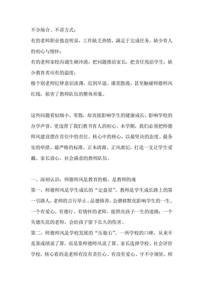 师德师风建设专题会议上校长讲话:守初心正师风铸师魂做学生成长的引路人晨晨老师4天前发布关注私信14.42KB6页0427 以下为资料部分截图预览,下载后为超高清原文件。 第1页 / 共6页 第2页 / 共6页 试读已结束,还剩4页,您可下载完整版后进行离线阅读 加入VIP,享海量教务资料,无限制免费下载所有材料 师德师风建设专题会议上校长讲话:守初心正师风铸师魂做学生成长的引路人此内容为付费资源,请付费后查看¥9.9¥15.9VIP会员免费代理(享70%分佣)免费立即购买您当前未登录!建议登陆后购买,可保存购买订单付费资源© 版权声明文章版权归作者所有,未经允许请勿转载。THE END校长讲话 文本预览 师德师风建设专题会议上校长讲话:守初心正师风铸师魂做学生成长的引路人各位老师:大家好!今天我们召开全校师德师风建设专题会议,不是一次常规的工作布置,而是一次直面问题、校准方向、坚守初心的专题部署。教师是立教之本、兴教之源,师德师风是教师的第一素养,是学校的立身之本,更是家长和社会最关心、最在意的核心问题。过去一段时间,在全体教职工的共同努力下,学校的教育教学、学生管理、校园安全等各项工作平稳推进,不少老师扎根讲台、潜心育人、默默奉献,用责任心和爱心赢得了学生的喜爱、家长的认可,这是我们全体教育工作者的共同骄傲。但在肯定成绩的同时,我们必须清醒自省、刀刃向内,直面当前我校师德师风建设中存在的短板与问题:有的老师备课流于形式,常年使用旧教案,课堂教学缺乏新意,对学生缺乏吸引力:有的老师教育方式简单粗暴,对学生缺少耐心、缺少尊重,批评教育 查看更多 收起部分 喜欢就支持一下吧点赞7 分享QQ空间微博QQ好友海报分享复制链接收藏