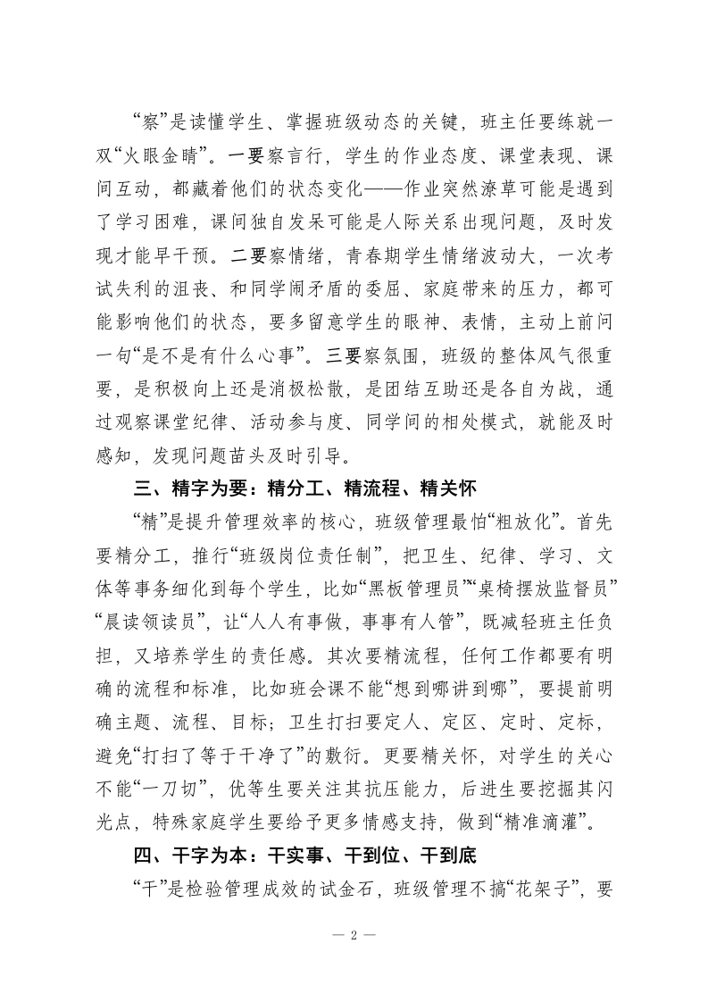 德育副校长在班主任会议上发言:立、察、精、干、活晨晨老师前天发布关注私信16.05KB4页03411 以下为资料部分截图预览,下载后为超高清原文件。 第1页 / 共4页 第2页 / 共4页 试读已结束,还剩2页,您可下载完整版后进行离线阅读 加入VIP,享海量教务资料,无限制免费下载所有材料 德育副校长在班主任会议上发言:立、察、精、干、活此内容为付费资源,请付费后查看¥9.9¥15.9VIP会员免费代理(享70%分佣)免费立即购买您当前未登录!建议登陆后购买,可保存购买订单付费资源© 版权声明文章版权归作者所有,未经允许请勿转载。THE END校长讲话 文本预览 德育副校长在班主任会议上发言:立、察、精、干、活各位班主任同仁:大家下午好!今天和大家继续深耕班级管理这门“慢艺术”。如果说教育是一场双向奔赴的成长,那班主任就是这场旅程的“领航者”一一既要稳住班级航船的方向,又要呵护每个学生的独特光芒。经过长期实践总结,我把班级管理提炼为“立、察、精、干、活”五字要诀,这五个字层层递进、环环相扣,希望能给大家的日常工作带来新的启发。一、立字为先:立规矩、立榜样、立底线“立”是班级管理的根基,没有“立”住的标准,后续工作只会一盘散沙。首先要立规矩,班规不能由老师单方面“下达”,而要和学生共同商议,从课堂纪律、卫生值日到人际交往,让学生明确“什么能做、什么不能做”,规则要具体可操作,比如“课堂发言先举手,他人讲话不打断”,而不是笼统的“遵守纪律”。其次要立榜样,班主任要做学生的“行走标杆”,要求学生不迟到,自己就要提前到岗;要求学生爱护公物,自己就要主动拾起地上的纸屑,言传身教的力量远胜于说教。更要立底线,安全、诚信、尊重他人这些核心原则,是不能触碰的“红线”,必须明确告知学生,一旦突破,要及时纠正引导,让学生知道底线不可越。二、察字为眼:察言行、察情绪、察氛围一1 查看更多 收起部分 喜欢就支持一下吧点赞11 分享QQ空间微博QQ好友海报分享复制链接收藏