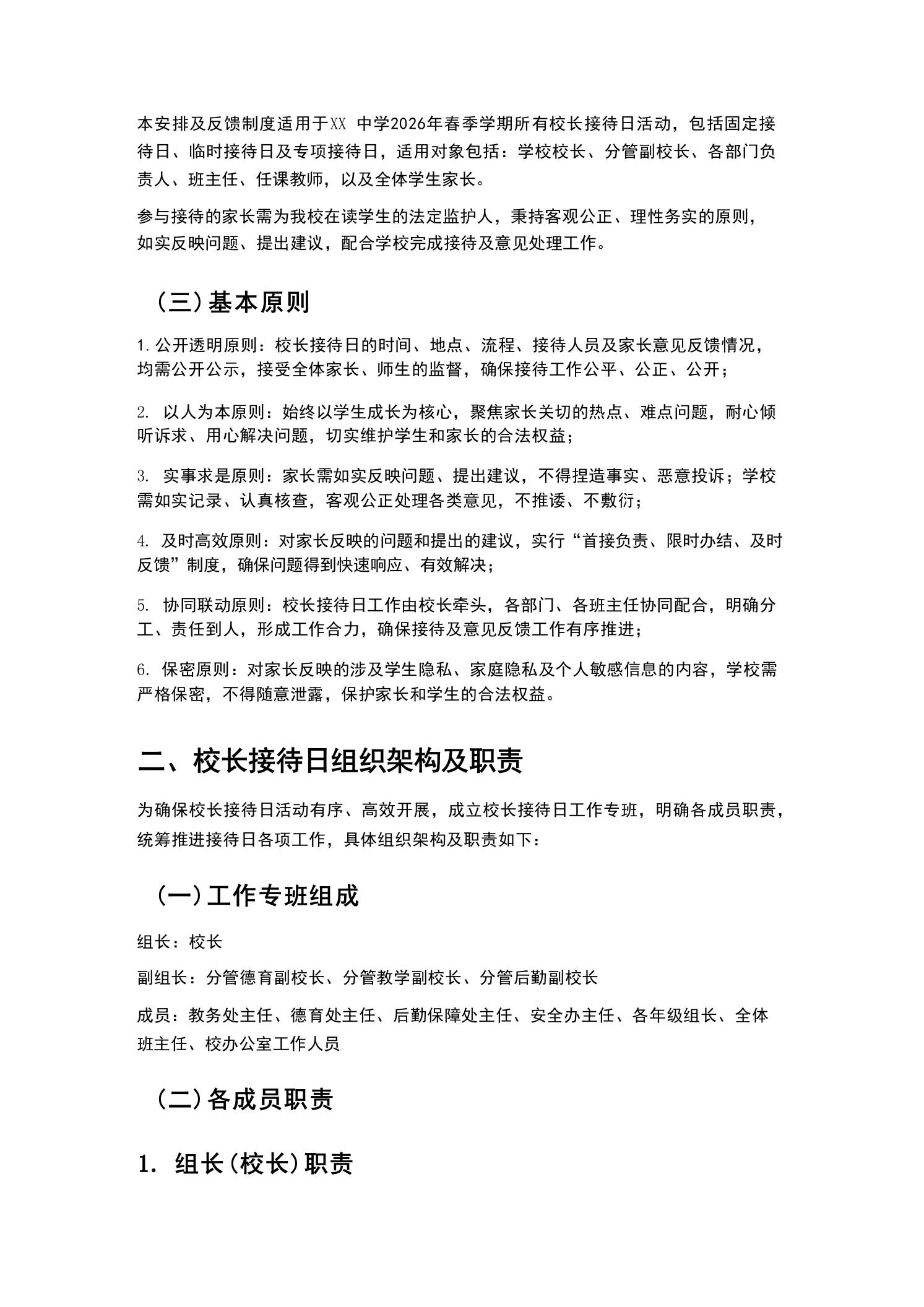XX P中学2026年春季学期校长接待日安排及家长意见反馈为深入贯彻落实立德树人根本任务,搭建学校与家长高效沟通的桥梁,倾听家长心声、回应家长关切、凝聚家校合力,及时解决学生成长、学校发展过程中存在的问题,不断优化办学质量、提升管理水平,切实保障学生全面发展、健康成长,结合我校2026年春季学期办学实际,特制定本校长接待日安排及家长意见反馈制度。本安排及反馈制度适用于本学期所有校长接待日活动的组织、开展、落实及家长意见的收集、处理、反馈全流程,全体教职工、学生家长均需严格遵守、积极配合。校长接待日是学校践行“以生为本、家校共育”办学理念的重要举措,是畅通家校沟通渠道、接受家长监督、改进学校工作的重要途径。通过常态化、规范化开展校长接待日活动,让家长全面了解学校的教育教学管理、师资建设、校园安全、学生培养等各项工作,及时反馈学生在校、在家的表现及诉求,共同探讨教育方法、破解教育难题,形成“学校主导、家长参与、家校协同、共建共育”的良好教育生态,推动我校教育教学工作持续高质量发展。总则(一)制定目的1.搭建家校沟通桥梁,畅通家长诉求表达渠道,倾听家长对学校教育教学、管理服务、校园建设等方面的意见和建议,及时回应家长关切;2.接受家长监督,规范学校办学行为,及时发现学校工作中存在的不足,优化工作流程、改进工作方法,提升学校管理水平和办学质量;3.凝聚家校合力,引导家长积极参与学校教育管理,形成家校协同育人共识,共同为学生营造良好的成长环境,促进学生德智体美劳全面发展;4.宣传学校办学理念、办学特色及各项工作部署,让家长全面了解学校发展规划、教育教学成果,增强家长对学校的信任和支持;5.及时化解家校矛盾,妥善处理家长反映的各类问题,维护学校正常教育教学秩序,构建和谐家校关系。(二)适用范围