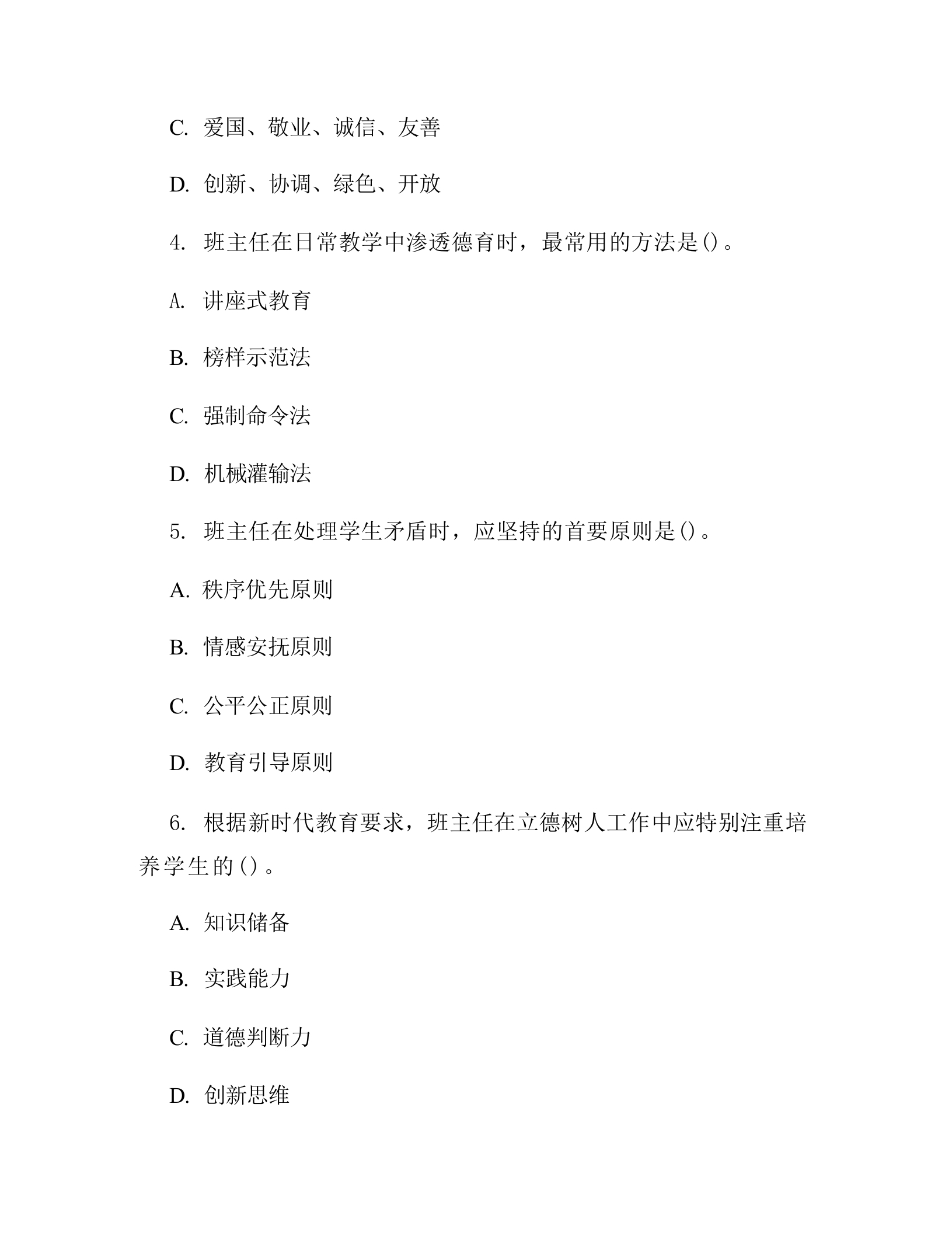 2026年教师立德树人根本任务知识测试题含答案(班主任版)晨晨老师19天前发布关注私信0.20MB12页0498 以下为资料部分截图预览,下载后为超高清原文件。 第1页 / 共12页 第2页 / 共12页 试读已结束,还剩10页,您可下载完整版后进行离线阅读 加入VIP,享海量教务资料,无限制免费下载所有材料 2026年教师立德树人根本任务知识测试题含答案(班主任版)此内容为付费资源,请付费后查看¥9.9¥15.9VIP会员免费代理(享70%分佣)免费立即购买您当前未登录!建议登陆后购买,可保存购买订单付费资源© 版权声明文章版权归作者所有,未经允许请勿转载。THE END班主任库 文本预览 2026年教师立德树人根本任务知识测试题含答案(班主任版)一、单选题(共10题,每题2分,共20分)1.班主任在落实立德树人根本任务时,首要遵循的教育原则是0。A.因材施教原则B.教学相长原则C.以生为本原则D.全面发展原则2.班主任在班级管理中,通过组织主题班会、社会实践等活动,主要培养学生的()。A.学习能力B.道德品质C.体育技能D.艺术素养3.依据《中小学德育工作指南》,班主任在德育工作中应重点引导学生树立的核心价值观不包括()。A.富强、民主、文明、和谐B.自由、平等、公正、法治 查看更多 收起部分 喜欢就支持一下吧点赞8 分享QQ空间微博QQ好友海报分享复制链接收藏