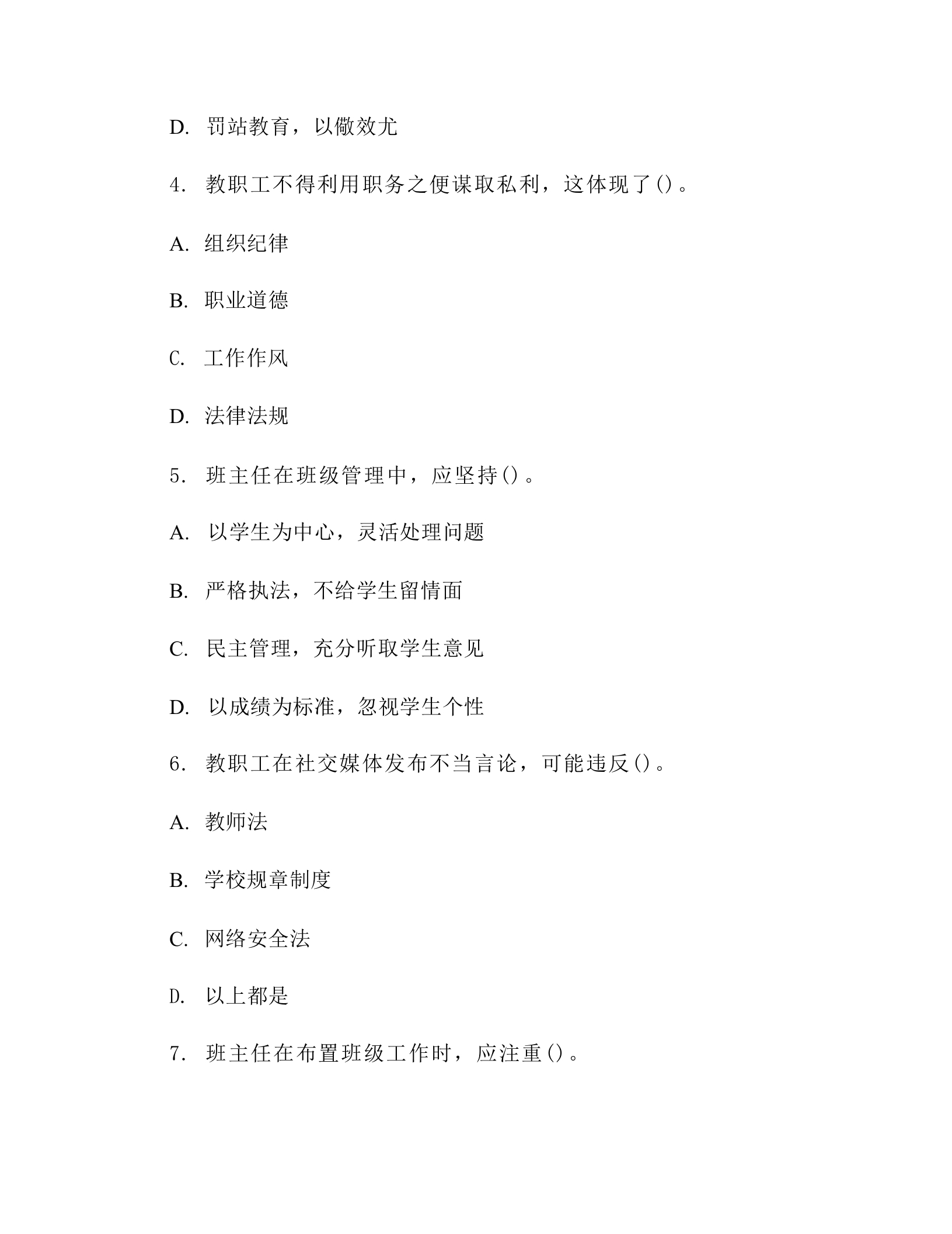2026年教职工组织纪律与作风建设测试题含答案(班主任版)晨晨老师19天前发布关注私信0.14MB14页0265 以下为资料部分截图预览,下载后为超高清原文件。 第1页 / 共14页 第2页 / 共14页 试读已结束,还剩12页,您可下载完整版后进行离线阅读 加入VIP,享海量教务资料,无限制免费下载所有材料 2026年教职工组织纪律与作风建设测试题含答案(班主任版)此内容为付费资源,请付费后查看¥9.9¥15.9VIP会员免费代理(享70%分佣)免费立即购买您当前未登录!建议登陆后购买,可保存购买订单付费资源© 版权声明文章版权归作者所有,未经允许请勿转载。THE END班主任库 文本预览 2026年教职工组织纪律与作风建设测试题含答案(班主任版)一、单选题(每题2分,共20题)1.班主任在处理学生矛盾时,应优先遵循的原则是()。A.私下解决,避免影响班级稳定B.保护学生隐私,不透露任何信息C.公开公正,以教育引导为主D.立即制止,防止矛盾升级2.教职工在校园内吸烟,违反了《中小学教师职业道德规范》中的()。A.关爱学生B.为人师表C.为国守法D.勤奋敬业3.班主任发现学生有欺凌行为,正确的处理方式是()。A.私下警告,避免影响班级和谐B.立即报告学校领导,并记录在案C.与家长私下协商,不公开处理 查看更多 收起部分 喜欢就支持一下吧点赞5 分享QQ空间微博QQ好友海报分享复制链接收藏