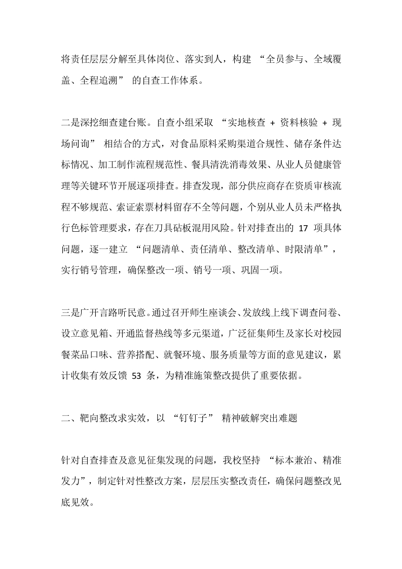 ‘校园餐’专项整治工作推进情况,校长汇报:筑牢安全防线,守护‘食’刻安心晨晨老师昨天发布关注私信14.64KB5页04212 以下为资料部分截图预览,下载后为超高清原文件。 第1页 / 共5页 第2页 / 共5页 试读已结束,还剩3页,您可下载完整版后进行离线阅读 加入VIP,享海量教务资料,无限制免费下载所有材料 ‘校园餐’专项整治工作推进情况,校长汇报:筑牢安全防线,守护‘食’刻安心此内容为付费资源,请付费后查看¥9.9¥15.9VIP会员免费代理(享70%分佣)免费立即购买您当前未登录!建议登陆后购买,可保存购买订单付费资源© 版权声明文章版权归作者所有,未经允许请勿转载。THE END计划汇报 文本预览 ‘校园餐’专项整治工作推进情况,校长汇报:筑牢安全防线,守护‘食’刻安心尊敬的各位领导、同仁:大家好!全市“校园餐”突出问题专项整治行动启动以来,我校深刻领会校园餐安全作为关乎师生健康福祉、回应家长热切期盼、维护社会和谐稳定的关键民生工程,始终以高度的政治责任感和务实作风,扎实推进各项整治工作。现将具体推进情况汇报如下:一、全面自查摸实情,以“零容忍”态度排查风险隐患我校将自查自纠作为专项整治的基础性工程,坚持问题导向、靶向发力,全面排查校园餐管理各环节风险隐患,确保全覆盖、无死角、零盲区。一是建强专班明责任。成立由校长牵头,分管副校长统筹,后勤主任、食堂管理员、教师代表、学生家长代表共同参与的专项自查小组,对照《校园食品安全与营养健康管理规定》等文件要求,制定涵盖食材采购、加工操作、环境卫生、经费使用等12个维度的详细自查清单, 查看更多 收起部分 喜欢就支持一下吧点赞12 分享QQ空间微博QQ好友海报分享复制链接收藏