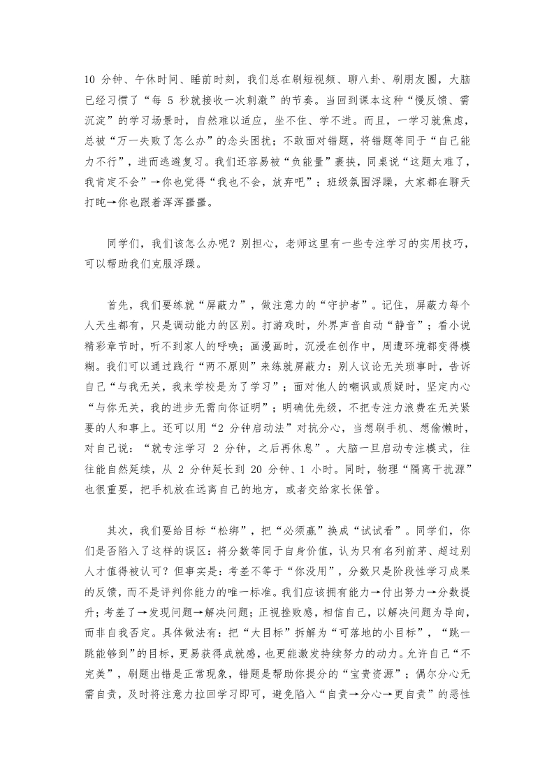 【高中】【初中】【考前复习】抗浮躁主题班会:从“心浮气躁”到“潜心向学”讲稿晨晨老师昨天发布关注私信16.90KB5页02910 以下为资料部分截图预览,下载后为超高清原文件。 第1页 / 共5页 第2页 / 共5页 试读已结束,还剩3页,您可下载完整版后进行离线阅读 加入VIP,享海量教务资料,无限制免费下载所有材料 【高中】【初中】【考前复习】抗浮躁主题班会:从“心浮气躁”到“潜心向学”讲稿此内容为付费资源,请付费后查看¥9.9¥15.9VIP会员免费代理(享70%分佣)免费立即购买您当前未登录!建议登陆后购买,可保存购买订单付费资源© 版权声明文章版权归作者所有,未经允许请勿转载。THE END综合资料计划汇报 文本预览 从“心浮气躁”到“潜心向学”(初)高中生考前复习抗浮躁主题班会发言稿亲爱的同学们:大家好!今天,我们聚在一起,召开这次主题班会,就是想和大家聊聊在考前复习阶段,如何克服浮躁,沉下心来好好学习,让我们的复习更加高效,让我们的未来更加从容绽放。同学们,不知道你们有没有想过,浮躁到底是什么?它就像一个无形的怪兽,悄悄地缠绕在我们身边。它让我们注意力分散,一会儿觉得铅笔不顺手要换笔,一会儿觉得桌面太乱要整理书包,听到走廊的脚步声就忍不住探头去看;它让我们急功近利,总想着不费力气就能成功,四处搜罗所谓的“秘籍”,痴迷“速成捷径”,轻信“一天背1000单词”“5小时攻克(初)高中物理”“一个月逆袭年级前十”等噱头:它还让我们情绪随分数大起大落,周考进步5分就信心爆棚,月考退步10分就陷入自我否定;更糟糕的是,它让我们过度关注无关琐事,同桌的新鞋子、同学聊的游戏皮肤、老师的状态变化都能轻易夺走我们的注意力,唯独对课本内容视而不见。同学们,浮躁的危害可不小。它会让我们看似忙碌,实则低效,单词背了几个又想起要记物理公式,最终一事无成:作业拖延成性,临近截止日期才熬夜赶工:错题本整理得工工整整,却再也不翻看。这样,我们的学习效率大幅下滑,表面学习10小时,实际有效投入仅2小时,别人做1套题的效果,堪比我们做3套;成绩也难以提升,学习不扎实,知识掌握不牢固,计算能力、错题总结等关镀环节缺失,考试时频繁出现“似曾相识却不会做”的情况;而且,我们的心态还会陷入恶性循环,越急于求成越学不进去,越学不进去越焦虑,最终心态崩盘;更严重的是,浮躁的心态会延伸到我们生活的各个方面,未来工作中也难以专注完成任务,影响效率和质量。那么,为什么我们会觉得静心如此艰难呢?同学们,你们有没有发现,课间 查看更多 收起部分 喜欢就支持一下吧点赞10 分享QQ空间微博QQ好友海报分享复制链接收藏