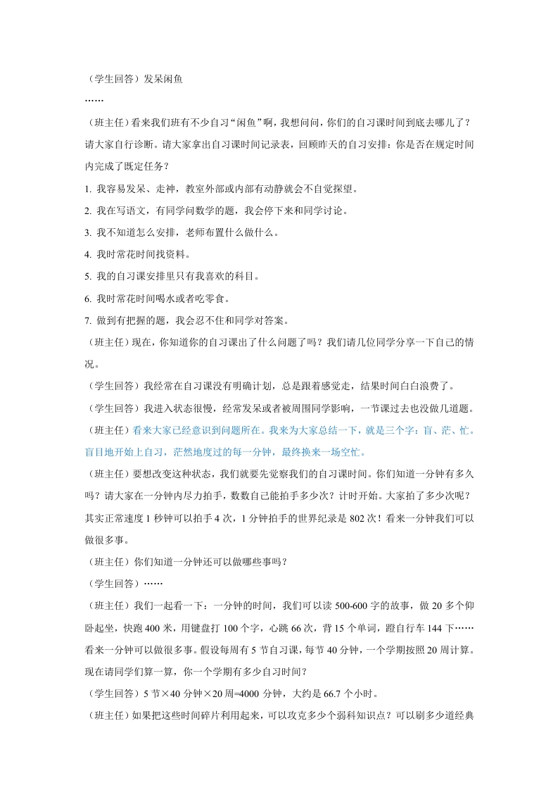 【通用】【学法指导】自习课主题班会:告别自习“闲”鱼文字稿晨晨老师昨天发布关注私信24.13KB7页03111 以下为资料部分截图预览,下载后为超高清原文件。 第1页 / 共7页 第2页 / 共7页 试读已结束,还剩5页,您可下载完整版后进行离线阅读 加入VIP,享海量教务资料,无限制免费下载所有材料 【通用】【学法指导】自习课主题班会:告别自习“闲”鱼文字稿此内容为付费资源,请付费后查看¥9.9¥15.9VIP会员免费代理(享70%分佣)免费立即购买您当前未登录!建议登陆后购买,可保存购买订单付费资源© 版权声明文章版权归作者所有,未经允许请勿转载。THE END综合资料计划汇报 文本预览 告别自习“闲”鱼自习课学法指导主题班会教案班会主题:告别自习“闲”鱼【班会背景】自习课是自我学习、自我提升的关键时段,它有助于巩固课堂所学知识、加深知识的理解,还能培养自主学习能力。然而学生对自习课的认识存在不足。面对大量的“空白时间”,他们往往不知如何规划,容易陷入不知所措的境地:同时,由于自学能力有限,学生容易出现“消极怠学”的情况:此外,他们难以抵御学习以外的诱惑,如聊天、吃零食等,甚至使用电子产品,导致时间利用率较低。基于此,本节班会将引导学生了解自习课的学习任务,掌握提升自习课效率的方法与技巧,认识自习课的重要意义,将其视为提升学习成绩和综合素质的宝贵契机。【班会目的】1.知识与技能:让学生深刻理解自习课对于个人学习进步的重要性。2.过程与方法:引导学生掌握有效的自习方法和技巧。3.情感态度与价值观:通过班会活动,培养学生良好的自习习惯和纪律意识,提高学生的自主学习能力。【教学重难点】1.教学重点:自习课的任务及学习策略。2.教学难点:如何让学生真正认识到自习课的价值,引导学生克服自习课中的各种干扰因素。【班会准备】黑板报、pp、安排班级学霸准备自习课学习小妙招【班会过程】第一部分你是自习“闲”鱼吗(班主任)同学们,大家下午好,今天我们要开一场关于自习课“闲”鱼的班会。我们先对号入座一下,你是哪种“闲鱼”?(学生回答)社交闲鱼 查看更多 收起部分 喜欢就支持一下吧点赞11 分享QQ空间微博QQ好友海报分享复制链接收藏