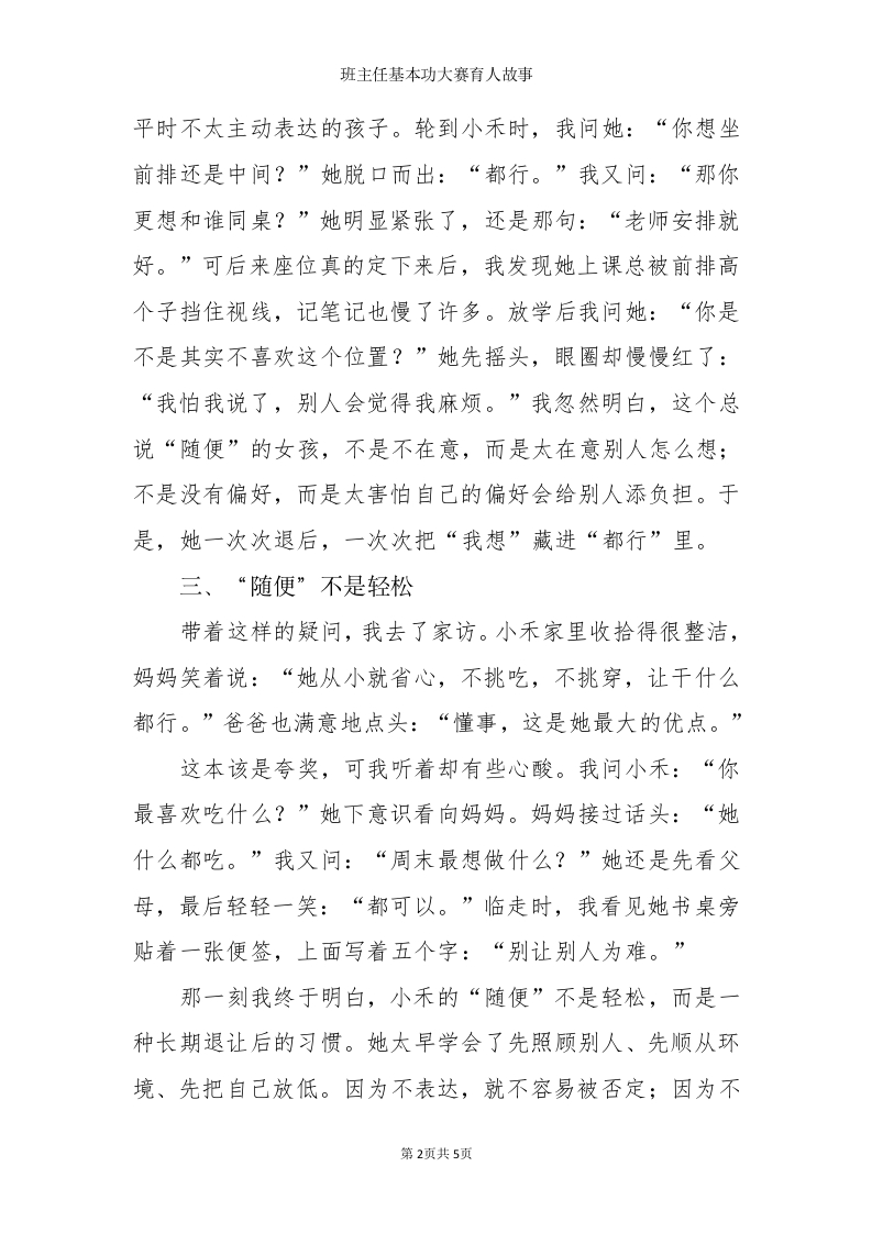 “随便”背后的不随便——一个“懂事”女孩找回自我的成长记晨晨老师14天前发布关注私信0.19MB5页0278 以下为资料部分截图预览,下载后为超高清原文件。 第1页 / 共5页 第2页 / 共5页 试读已结束,还剩3页,您可下载完整版后进行离线阅读 加入VIP,享海量教务资料,无限制免费下载所有材料 “随便”背后的不随便——一个“懂事”女孩找回自我的成长记此内容为付费资源,请付费后查看¥9.9¥15.9VIP会员免费代理(享70%分佣)免费立即购买您当前未登录!建议登陆后购买,可保存购买订单付费资源© 版权声明文章版权归作者所有,未经允许请勿转载。THE END班主任库 文本预览 班主任基本功大赛育人故事“随便”背后的不随便一个“懂事”女孩找回自我的成长记小禾,是班里最“省心”的孩子之一。她不争不抢,不闹不躁,安排座位时说“都可以”,分配任务时说“我都行”,活动排练、社团报名、值日分工,只要轮到她表达意见,她总会轻轻一句:“随便吧。”起初,我也觉得这是个温和懂事的孩子。可时间久了,我却越来越不安:一个十三四岁的女孩,真的会对什么都没有偏好吗?一、“随便”成了口头真正让我警觉的,是一次小组展示。那次阅读分享的展示稿,基本是小禾整理完成的,组员们也一致推她上台。可临到发言,她却往后退了一步:“都行,谁讲都可以。”最后,另一名准备不足的同学仓促上阵,效果并不好。课后我问她:“明明是你准备得最充分,为什么不上去?”她低着头,只说了一句:“谁上都一样。”可我知道,不一样。只是她太习惯在该往前的时候,把自己轻轻放回后面。二、“随便”藏着退缩后来我开始留意她,才发现“随便”几乎成了她的口头禅。午饭吃什么,随便;劳动做哪项,随便;发奖品挑什么颜色,随便。她不是没有想法,而是总在需要表达时,先把想法收起来。一次班里自主换座位,我特意把第一轮选择权交给几个第1页共5页 查看更多 收起部分 喜欢就支持一下吧点赞8 分享QQ空间微博QQ好友海报分享复制链接收藏