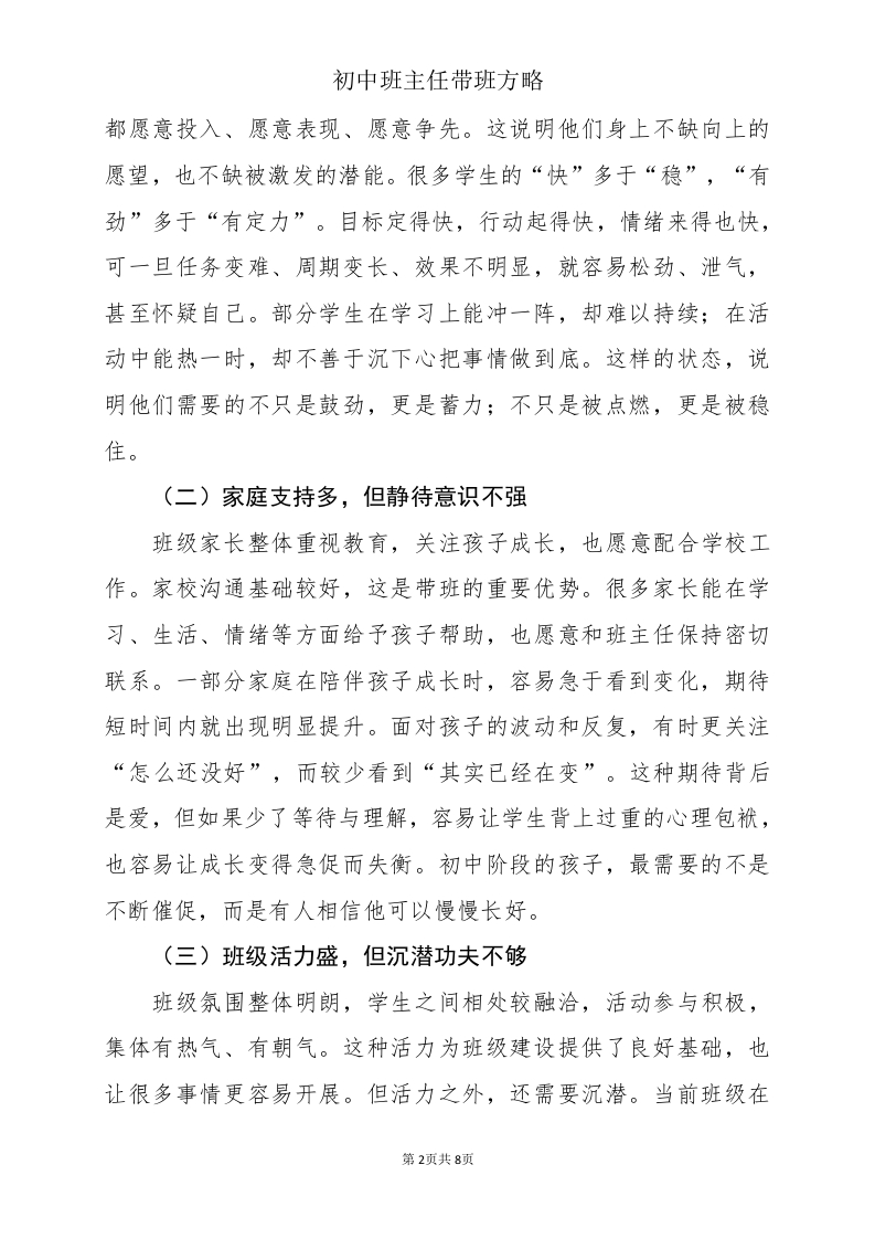 蓄力于深处,舒展于晴时——“向荷”班的成长密码文字稿晨晨老师14天前发布关注私信0.30MB8页02711 以下为资料部分截图预览,下载后为超高清原文件。 第1页 / 共8页 第2页 / 共8页 试读已结束,还剩6页,您可下载完整版后进行离线阅读 加入VIP,享海量教务资料,无限制免费下载所有材料 蓄力于深处,舒展于晴时——“向荷”班的成长密码文字稿此内容为付费资源,请付费后查看¥9.9¥15.9VIP会员免费代理(享70%分佣)免费立即购买您当前未登录!建议登陆后购买,可保存购买订单付费资源© 版权声明文章版权归作者所有,未经允许请勿转载。THE END班主任库 文本预览 初中班主任带班方略蓄力于深处,舒展于睛时一“向荷”少年的成长密码一、育人理念育人理念,向下蓄根,向上舒展,初中三年,是一个人精神拔节、性格定型、习惯沉淀的重要阶段。这个时期的学生,往往有热情、有想法、有冲劲,也有波动、有迷茫、有反复。他们像一株正在生长的荷,表面上努力向上,内里却更需要安静扎根。教育如果只看花开,容易催促;如果懂得根系,才会守护。我把班级命名为“向荷”,并将“向下蓄根,向上舒展”作为带班理念。荷之为物,生于水泽,却不浮于表;根扎深处,方能叶展晴空。它提醒我,真正有力量的成长,不是一路高歌猛进,而是在沉静中积蓄,在磨炼中丰盈,在恰当的时候自然舒展。带班也是如此,不能只盯着一时的结果,更要关注学生能否在日常中沉住气、稳住心、练出劲、长出骨。班级育人,不是把学生推着往前走,而是帮助他们在成长的关键阶段,把根扎稳,把力蓄足,把姿态养好。让每个孩子都能在自己的节奏里沉潜、积累、拔节、向上,成为内心有定力、行动有力量、眼中有光亮的“向荷”少年。二、班情分析(一)学生心气足,但成长定力不足班里学生整体精神状态较好,思维活跃,参与意识强,愿意尝试,也敢于表达。无论是课堂互动还是活动组织,大多数学生第1页共8页 查看更多 收起部分 喜欢就支持一下吧点赞11 分享QQ空间微博QQ好友海报分享复制链接收藏