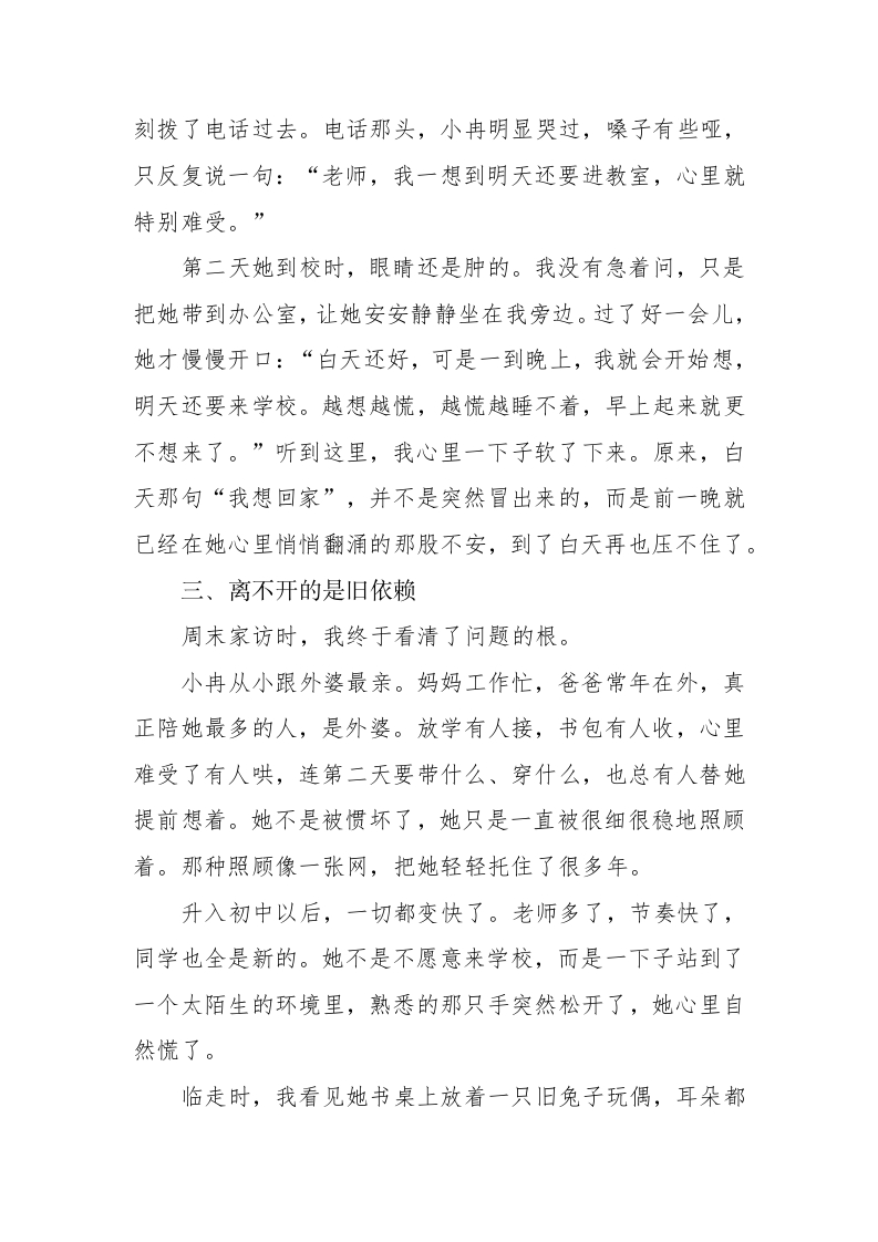 “我想回家”之后——一个敏感女孩的“安心”重建记docx晨晨老师14天前发布关注私信0.20MB5页0237 以下为资料部分截图预览,下载后为超高清原文件。 第1页 / 共5页 第2页 / 共5页 试读已结束,还剩3页,您可下载完整版后进行离线阅读 加入VIP,享海量教务资料,无限制免费下载所有材料 “我想回家”之后——一个敏感女孩的“安心”重建记docx此内容为付费资源,请付费后查看¥9.9¥15.9VIP会员免费代理(享70%分佣)免费立即购买您当前未登录!建议登陆后购买,可保存购买订单付费资源© 版权声明文章版权归作者所有,未经允许请勿转载。THE END班主任库 文本预览 “我想回家”之后敏感女孩的“安心”重建记一、回家成了口头执念小冉第一次跟我说“老师,我想回家”,是在开学第三天。那天第二节课刚下,她站在我办公桌边,脸色有点白,声音也轻得像一张薄纸:“老师,我不舒服,我想回家。”我让她先坐下歇一歇,又给她倒了杯温水。她捧着水杯,小口小口地喝着,喝完却没有走,只是低着头站在那里。过了一会儿,她又轻轻补了一句:“老师,我还是想回家。”起初,我以为这只是刚进新环境的不适应。可接下来的几天,这句话出现得越来越频繁。她不是那种爱哭闹的孩子。恰恰相反,她安静、细弱、很少给人添麻烦。也正因为如此,她那句总带着迟疑和克制的“我想回家”,反而更让我揪心。那不像一句撒娇,更像是一个孩子在心里反复权衡了很久,才小心翼翼递出来的求助。慢慢地,我发现,“我想回家”已经不只是她一时的情绪,而像一根细细的藤,悄悄缠住了她在学校里的每一天。二、不安总在夜里浮起真正让我意识到事情没那么简单,是一个晚上。那天晚上九点多,小冉妈妈发来消息,说孩子哭得厉害,怎么劝都劝不住,一边哭一边说“明天不想去学校”。我立 查看更多 收起部分 喜欢就支持一下吧点赞7 分享QQ空间微博QQ好友海报分享复制链接收藏