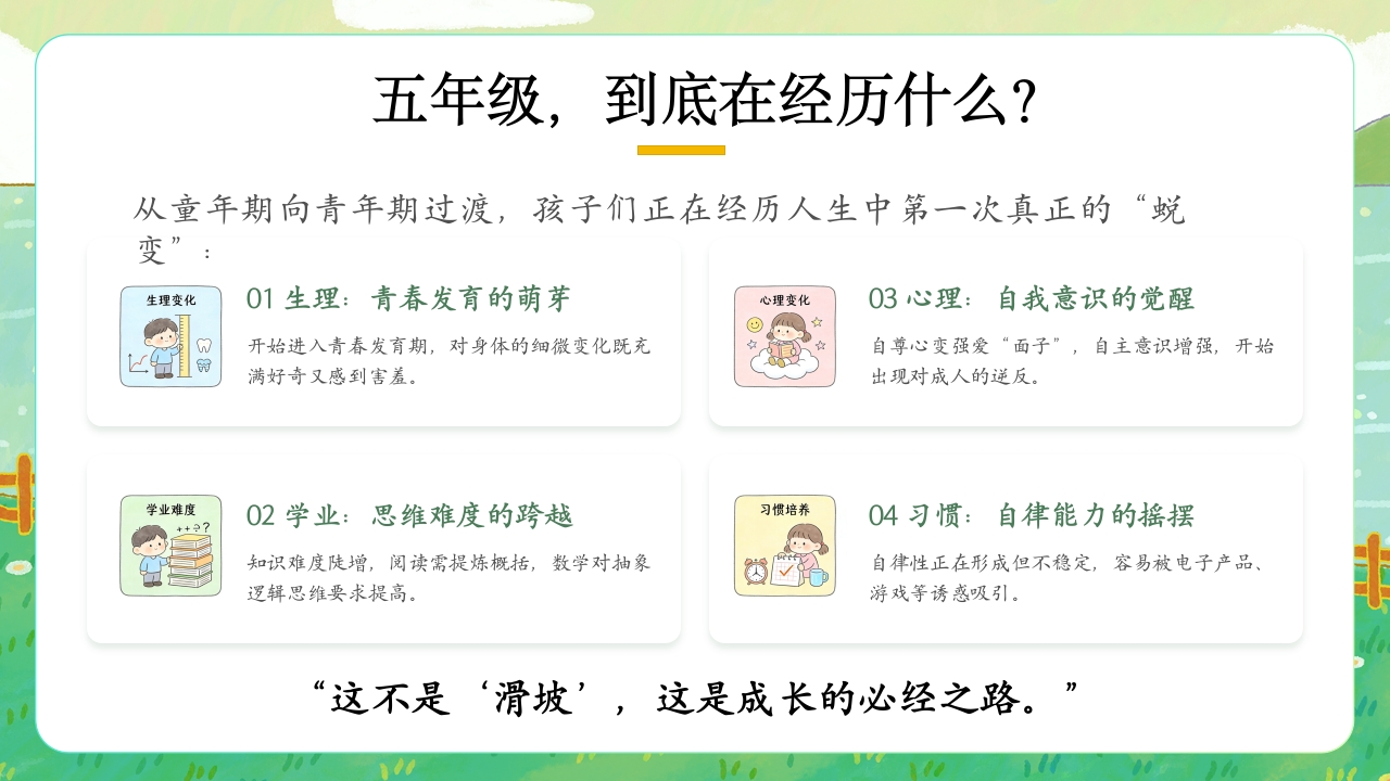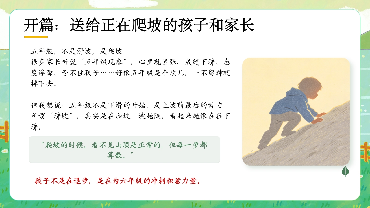 【五年级下】【期中】【语文】家长会:五年级,不是滑坡是爬坡晨晨老师11小时前发布关注私信59.56MB70页05210 以下为资料部分截图预览,下载后为超高清原文件。 第1页 / 共70页 第2页 / 共70页 第3页 / 共70页 第4页 / 共70页 第5页 / 共70页 第6页 / 共70页 第7页 / 共70页 第8页 / 共70页 第9页 / 共70页 试读已结束,还剩61页,您可下载完整版后进行离线阅读 加入VIP,享海量教务资料,无限制免费下载所有材料 【五年级下】【期中】【语文】家长会:五年级,不是滑坡是爬坡此内容为付费资源,请付费后查看¥9.9¥15.9VIP会员免费代理(享70%分佣)免费立即购买您当前未登录!建议登陆后购买,可保存购买订单付费资源© 版权声明文章版权归作者所有,未经允许请勿转载。THE END家长会 文本预览 五年级不是滑坡,是爬坡主讲人:XX老师时间:2026/4/XX 查看更多 收起部分 喜欢就支持一下吧点赞10 分享QQ空间微博QQ好友海报分享复制链接收藏