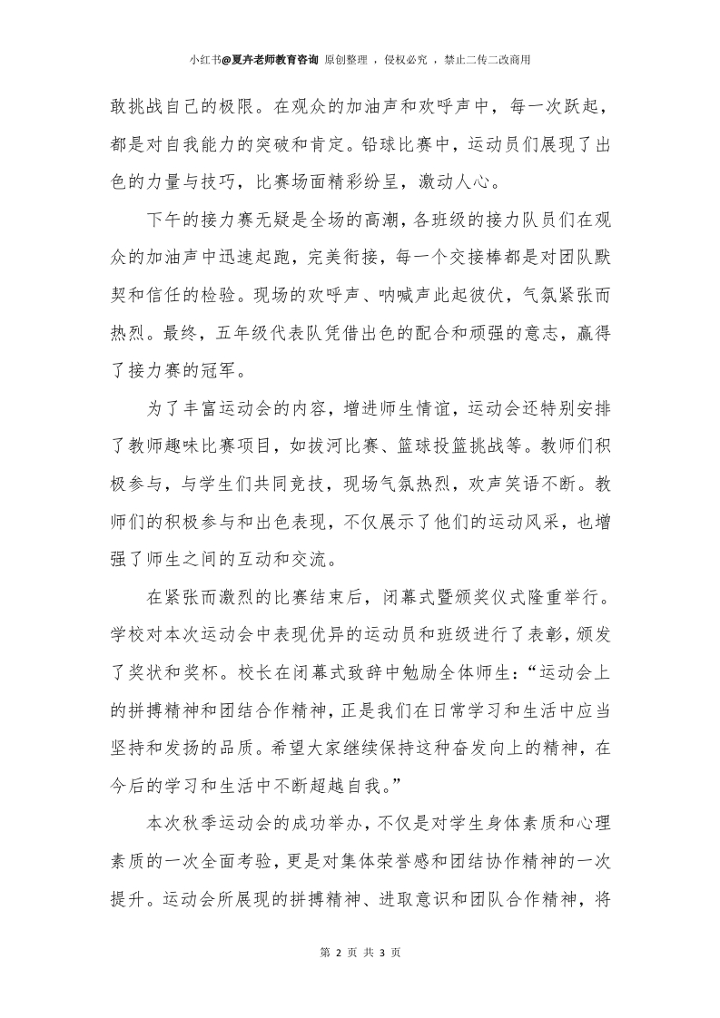 2024年秋季运动会新闻稿(1)xiaozhi33164个月前发布关注私信0.39MB3页04914 以下为资料部分截图预览,下载后为超高清原文件。 第1页 / 共3页 第2页 / 共3页 试读已结束,还剩1页,您可下载完整版后进行离线阅读 加入VIP,享海量教务资料,无限制免费下载所有材料 2024年秋季运动会新闻稿(1)此内容为付费资源,请付费后查看¥9.99¥15.99VIP会员免费代理(享70%分佣)免费立即购买您当前未登录!建议登陆后购买,可保存购买订单付费资源© 版权声明文章版权归作者所有,未经允许请勿转载。THE END教研计划 喜欢就支持一下吧点赞14 分享QQ空间微博QQ好友海报分享复制链接收藏