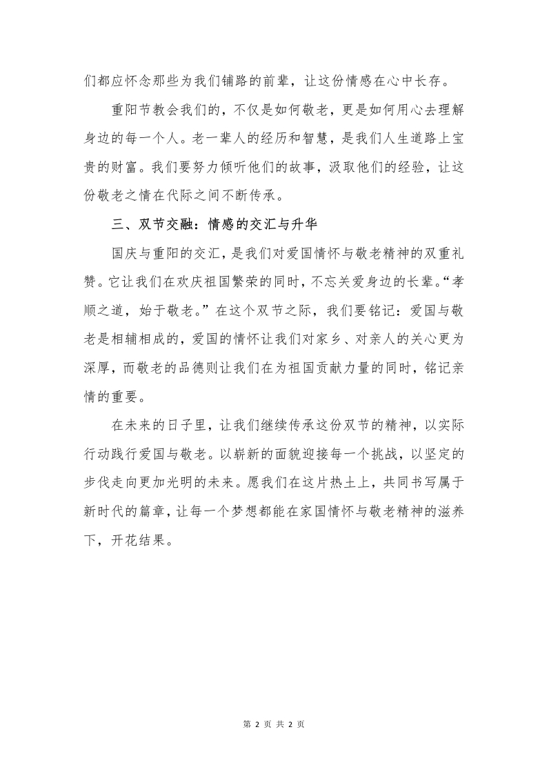 国庆节撞上重阳节学生讲话稿(1)xiaozhi33164个月前更新关注私信0.39MB2页0436 以下为资料部分截图预览,下载后为超高清原文件。 第1页 / 共2页 第2页 / 共2页 已完成全部阅读,共2页 加入VIP,享海量教务资料,无限制免费下载所有材料 © 版权声明文章版权归作者所有,未经允许请勿转载。THE END工作发言 喜欢就支持一下吧点赞6 分享QQ空间微博QQ好友海报分享复制链接收藏